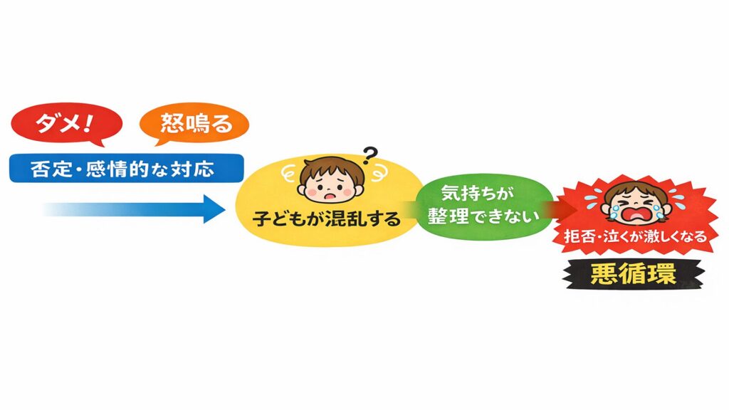 積み重なると、拒否の言葉や泣きが強まる場面が増えていきます。行動のみを抑える関わり方では、気持ちの整理が進みにくくなるのです。