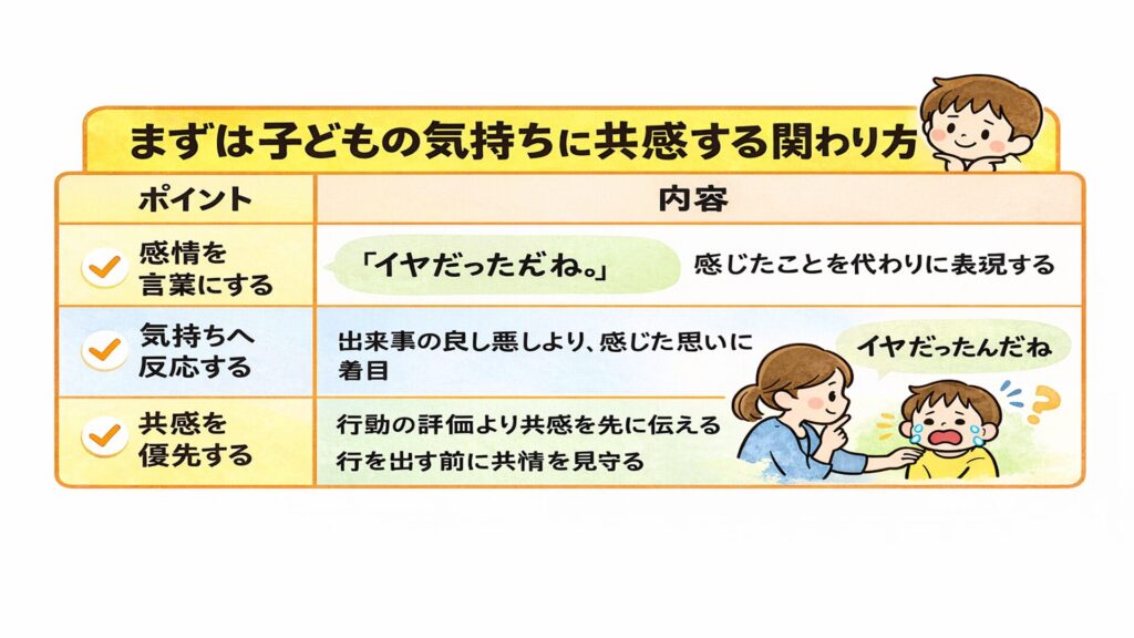 気持ちを理解された経験は、子どもに安心感をもたらします。自己主張が強まる時期は、思いを言葉にする力が十分ではありません。感情を代弁することで、内側の混乱が整理されやすくなるのです。