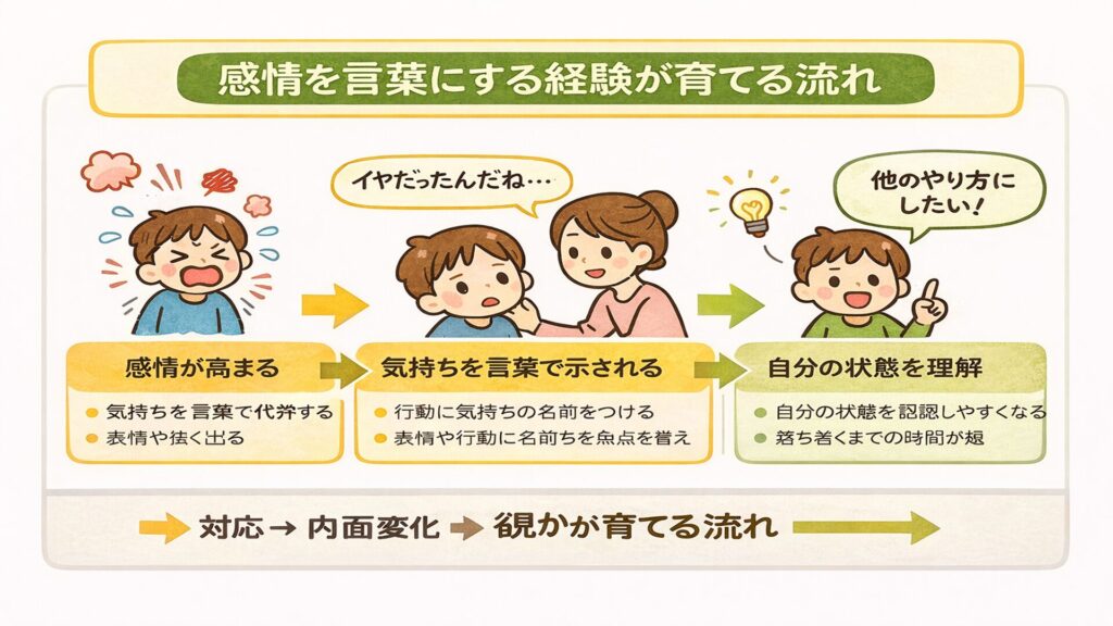 イヤイヤ期は、感情が強く動く一方で言語化が追いつかない時期です。気持ちを代弁される経験が重なると、内面の状態を理解する土台が整いやすくなります。