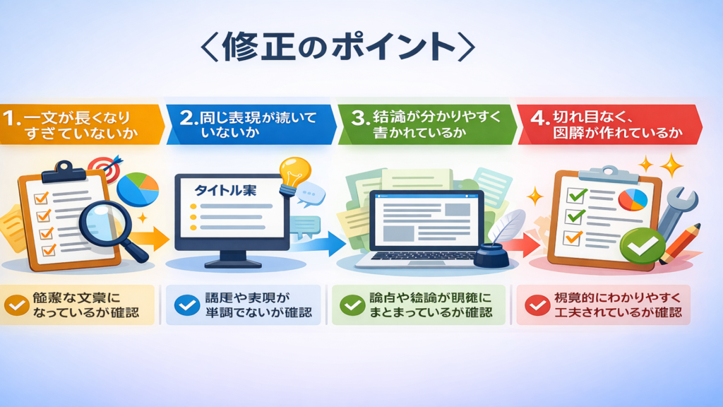 修正ポイントを絞ると、初心者でも対応しやすくなります。完璧を目指しすぎると作業量が膨らみ、執筆自体が続かなくなることも多いのです。最低限の調整だけでも記事の品質は十分に上がります。