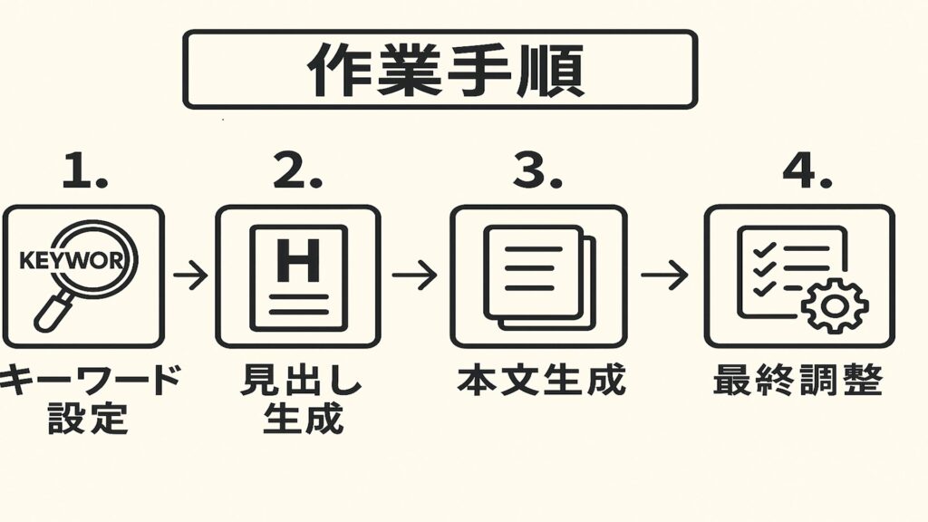 AIライティングは、正しい順番で進めると作業効率が大きく変わります。場当たり的に文章生成を行うと修正が増え、結果的に時間を消費しがちです。